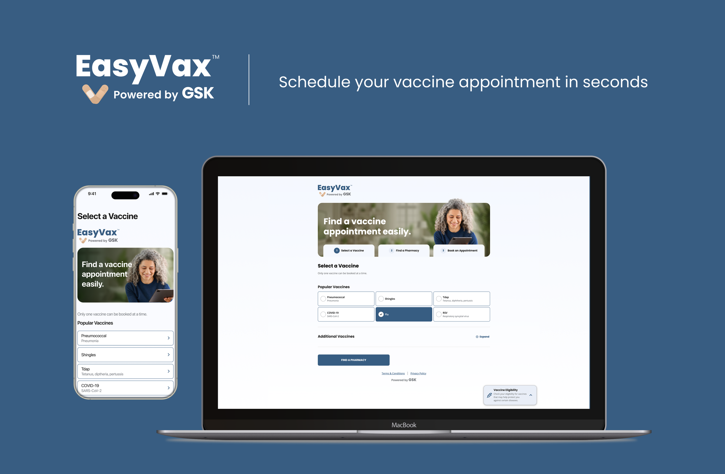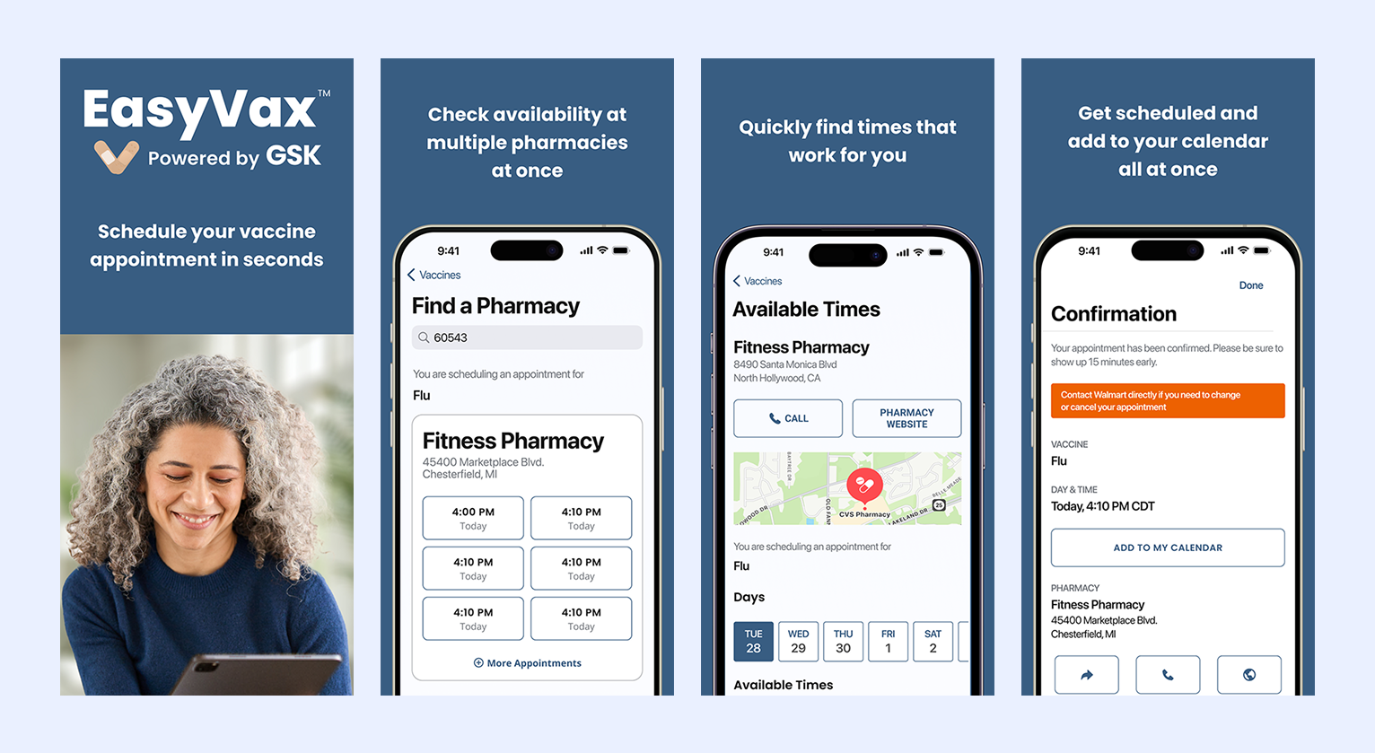 EasyVax is an app and website that helps users schedule a vaccine appointment at nearby pharmacies in 60 seconds or less. As the app has grown we’ve added additional features like a vaccine eligibility quiz and co-administration of vaccines.