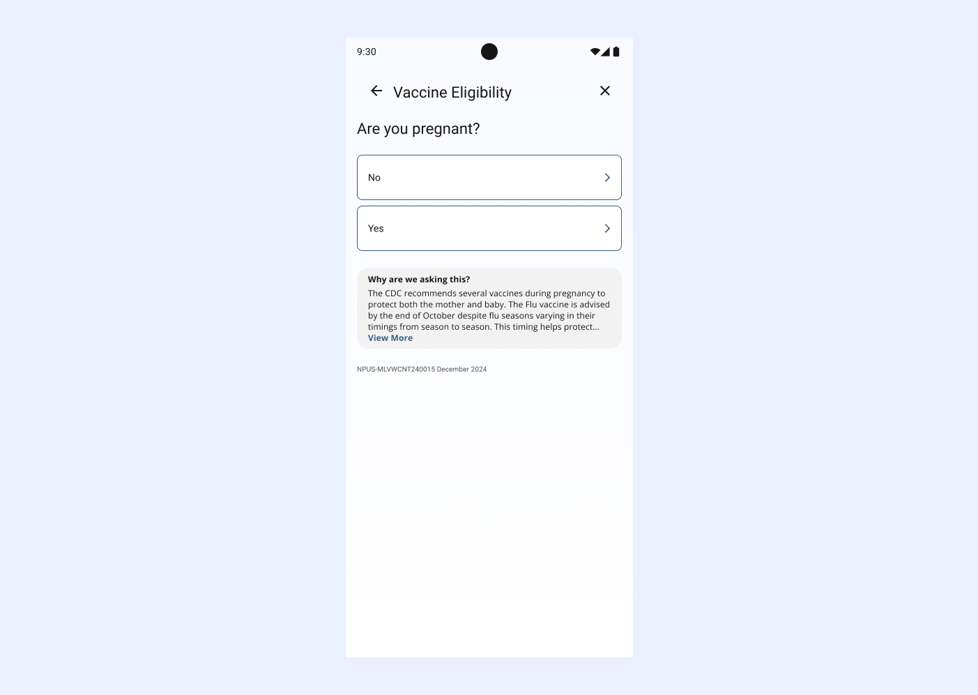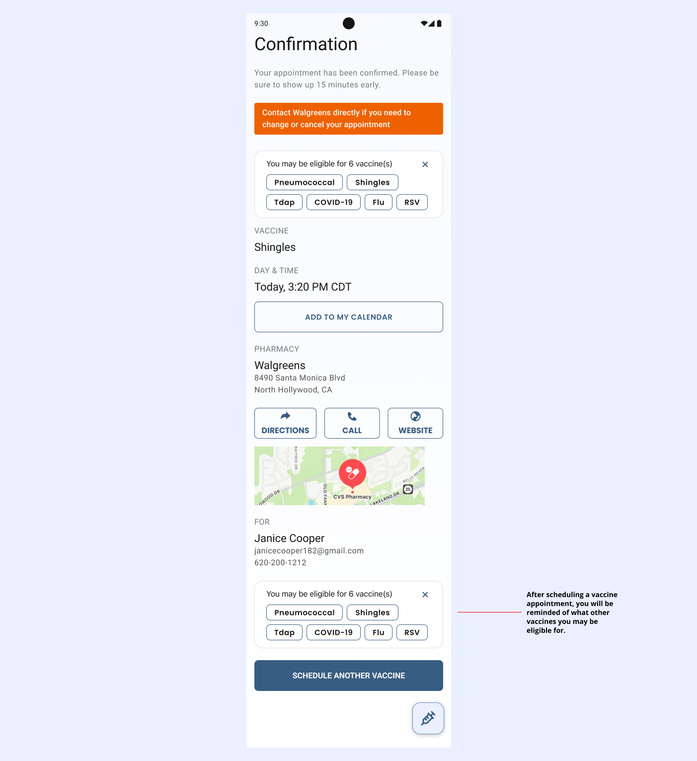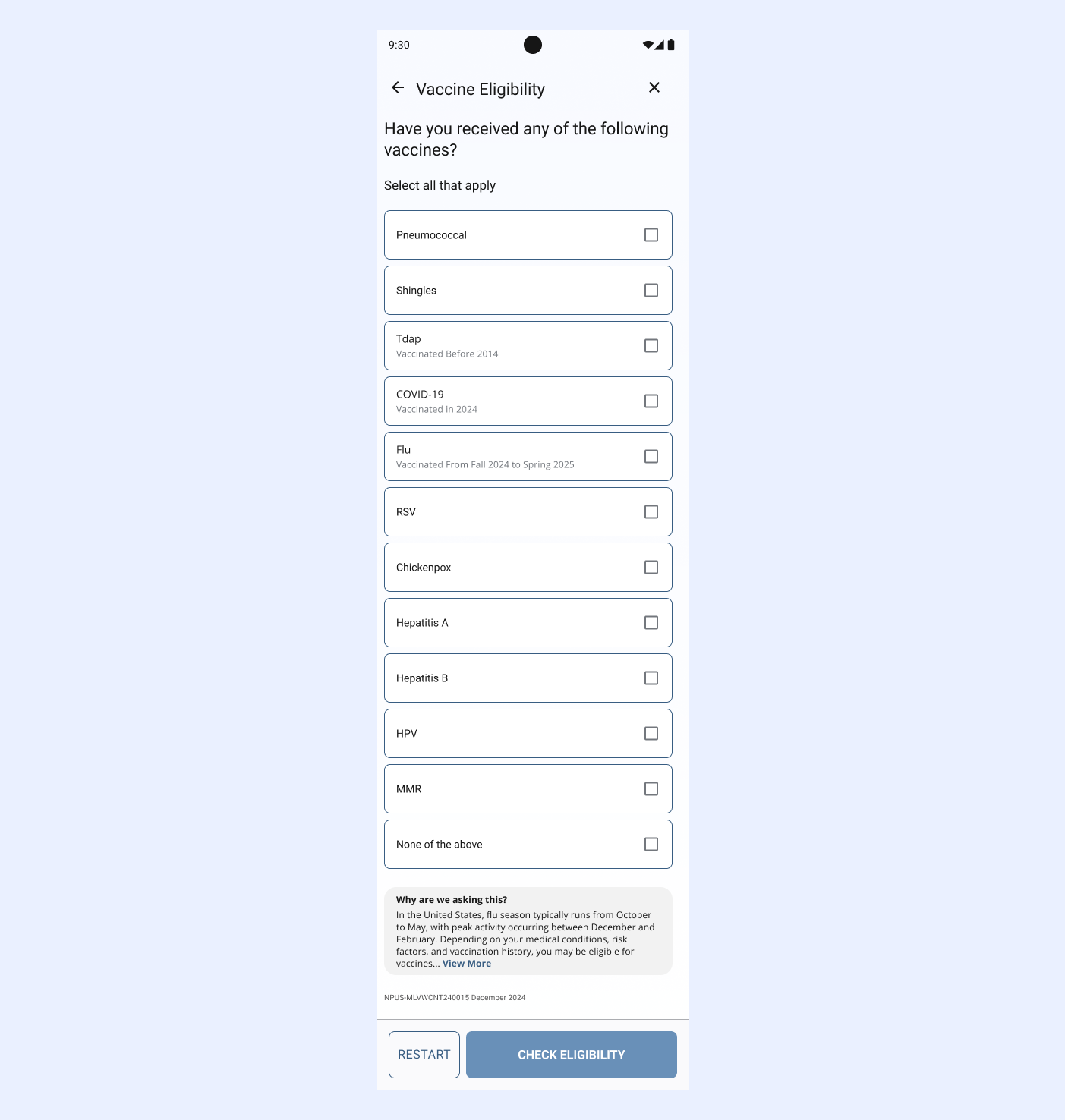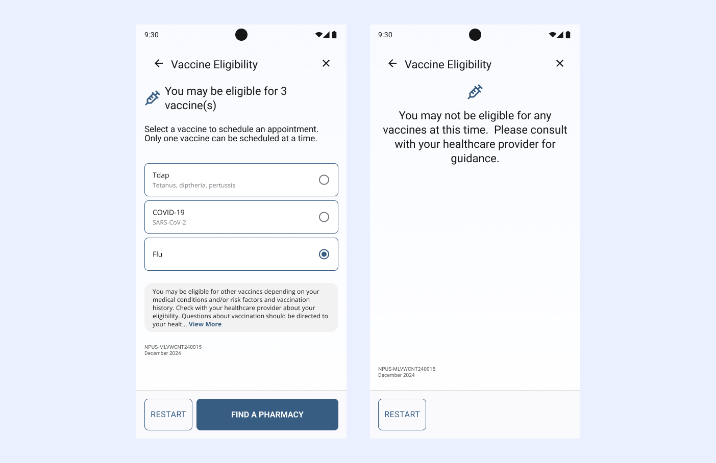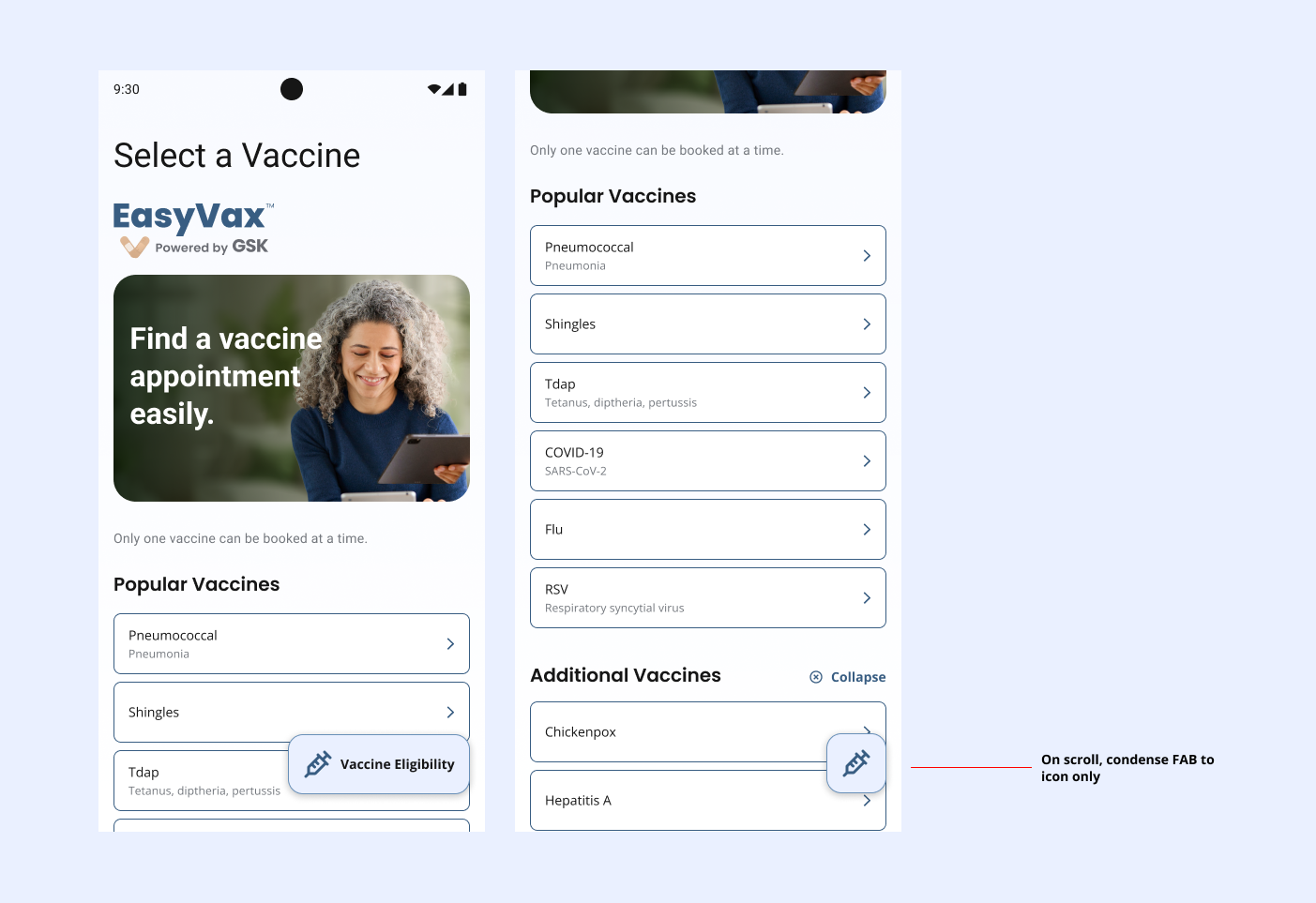 As the platform matured, GSK realized EasyVax was a great tool that could be used outside of the doctor’s office. With paid advertising, they began to direct traffic to the site and apps. This meant additional context needed to be added to the flow. Visitors may not know what vaccines they are eligible for, so we added an eligibility quiz to help them. The quiz is presented as a floating action button so that it does not distract from the main flow of scheduling a vaccine, but is readily available if needed.